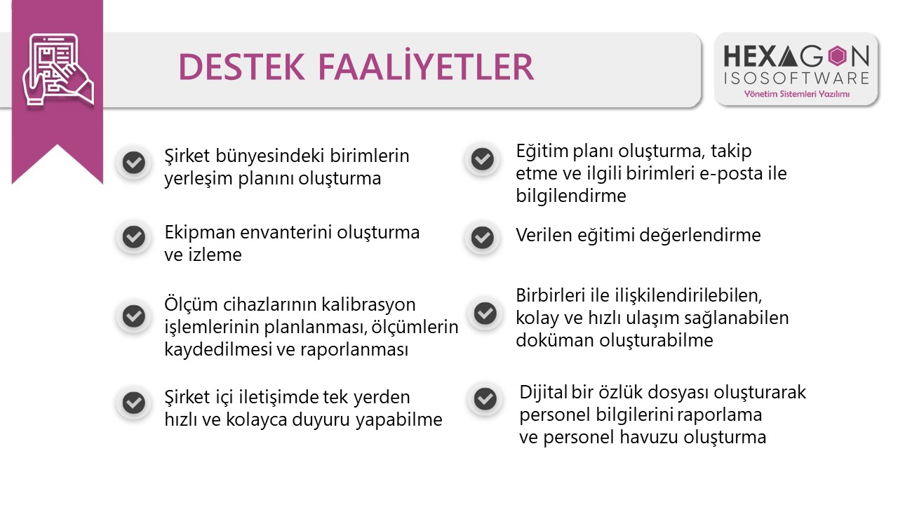 Kalite Yönetimi Standartları, kuruluşunuzun kalite sistem kontrolünün ve başarısının ayrılmaz bir parçasıdır. Süreçlerinizi, risklerinizi, sapmalarınızı, müşteri gereksinimlerinizi ve uymakla yükümlü olduğunuz standartların gerekliliklerini etkin bir şekilde yönetmenizi sağlar. Burada kuruluş etkin bir yönetim sistemi kurmak için gerekli kaynakları tedarik etmelidir. Etkin bir yönetim sistemi kurulması ve kontrol edilmesi için temel gerekliliklerden bir tanesi de HEXAGON ISO SOFTAWARE Kalite Yönetim Sistemi Yazılımıdır. HEXAGON ISO SOFTWARE ile sisteminizi etkin bir şekilde kurabilir ve yürütebilirsiniz.