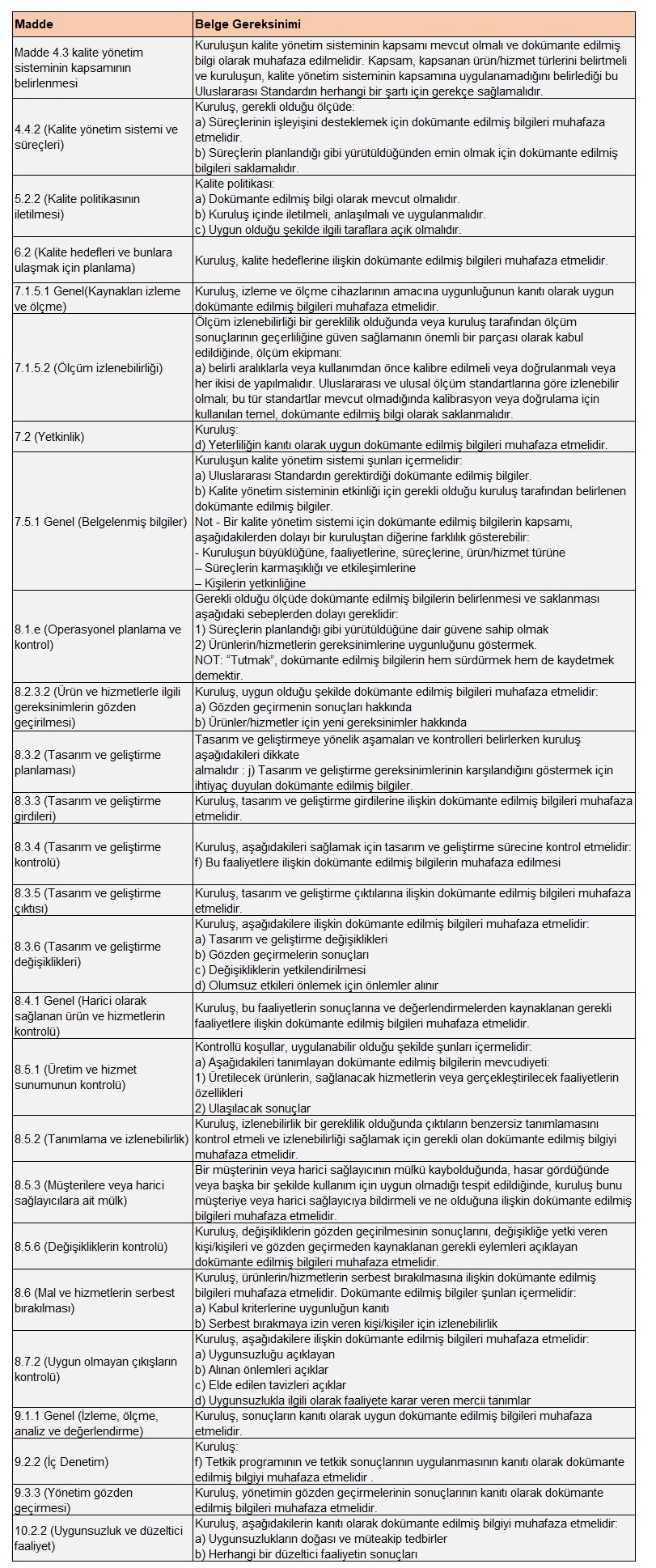Kuruluşun çalışması için gerekli bilgilerin iletilmesi amacıyla kuruluş tarafından tutulan dokümante edilmiş bilgiler, bunlarla sınırlı olmamak üzere şunları içerebilir (madde 4.4):