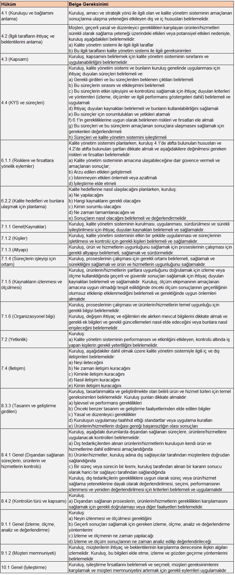 Kuruluşun KYS'si, ISO 9001'in gerektirdiği tüm belgelenmiş bilgileri ve KYS'nin etkinliği için kuruluş tarafından gerekli olduğu belirlenen belgelenmiş bilgileri içermelidir. Bununla birlikte dokümante edilmiş bilginin kapsamı, organizasyonun büyüklüğüne, faaliyetlerine, süreçlerine, ürün/hizmet türüne ve yetkinliğine bağlı olarak değişiklik gösterecektir.